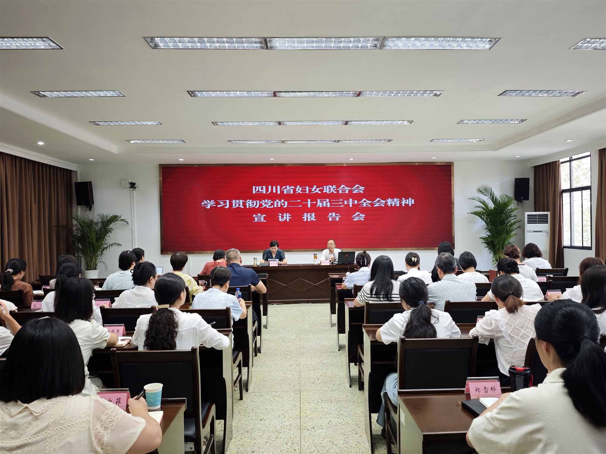 王華蓉在主持報告會時強調,學習好貫徹好黨的二十屆三中全會精神是當前和今后一個時期的重大政治任務。要提高政治站位,充分認識學習貫徹全會精神的重大意義,切實把思想和行動統一到全會的決策部署上來,齊心協力抓好全會精神貫徹落實,以實際行動堅定擁護“兩個確立”、堅決做到“兩個維護”。要抓好深學細悟,準確把握學習貫徹全會精神的核心要義,嚴格落實“第一議題”、黨組理論學習中心組學習、“三會一課”等制度,把學習全會精神作為婦聯執委、婦聯干部培訓的必修課,作為婦女思想政治引領的重要內容,依托新媒體平臺加強學習培訓,引導激勵全省廣大婦女投身改革、創新創業。要注重學用結合,以釘釘子精神抓好婦聯全面深化改革各項任務落實,在進一步全面深化改革大局中持續深化婦聯改革,把改革要求、創新精神貫穿婦聯工作全過程各方面,抓好“組織建設年”各項工作,鞏固提升“破難行動”成果,圍繞強“三性”、去“四化”,加強高素質專業化婦聯干部隊伍建設,以進一步全面深化改革推進四川婦聯工作高質量發展。