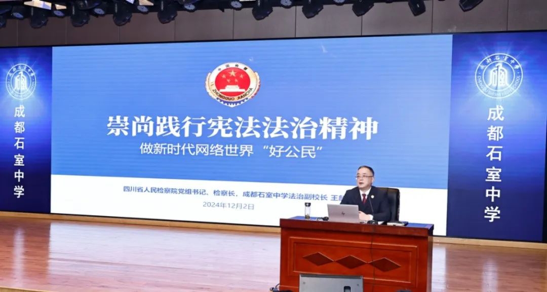 在紀(jì)念現(xiàn)行憲法公布施行42周年、第十一個(gè)國家憲法日來臨之際,12月2日,省檢察院黨組書記、檢察長、成都石室中學(xué)法治副校長王麟走進(jìn)成都石室中學(xué)(文廟校區(qū))開展“憲法宣傳周”法治進(jìn)校園活動(dòng),并以“崇尚踐行憲法法治精神 做新時(shí)代網(wǎng)絡(luò)世界‘好公民’”為題,為學(xué)校師生講授一堂專題法治課。