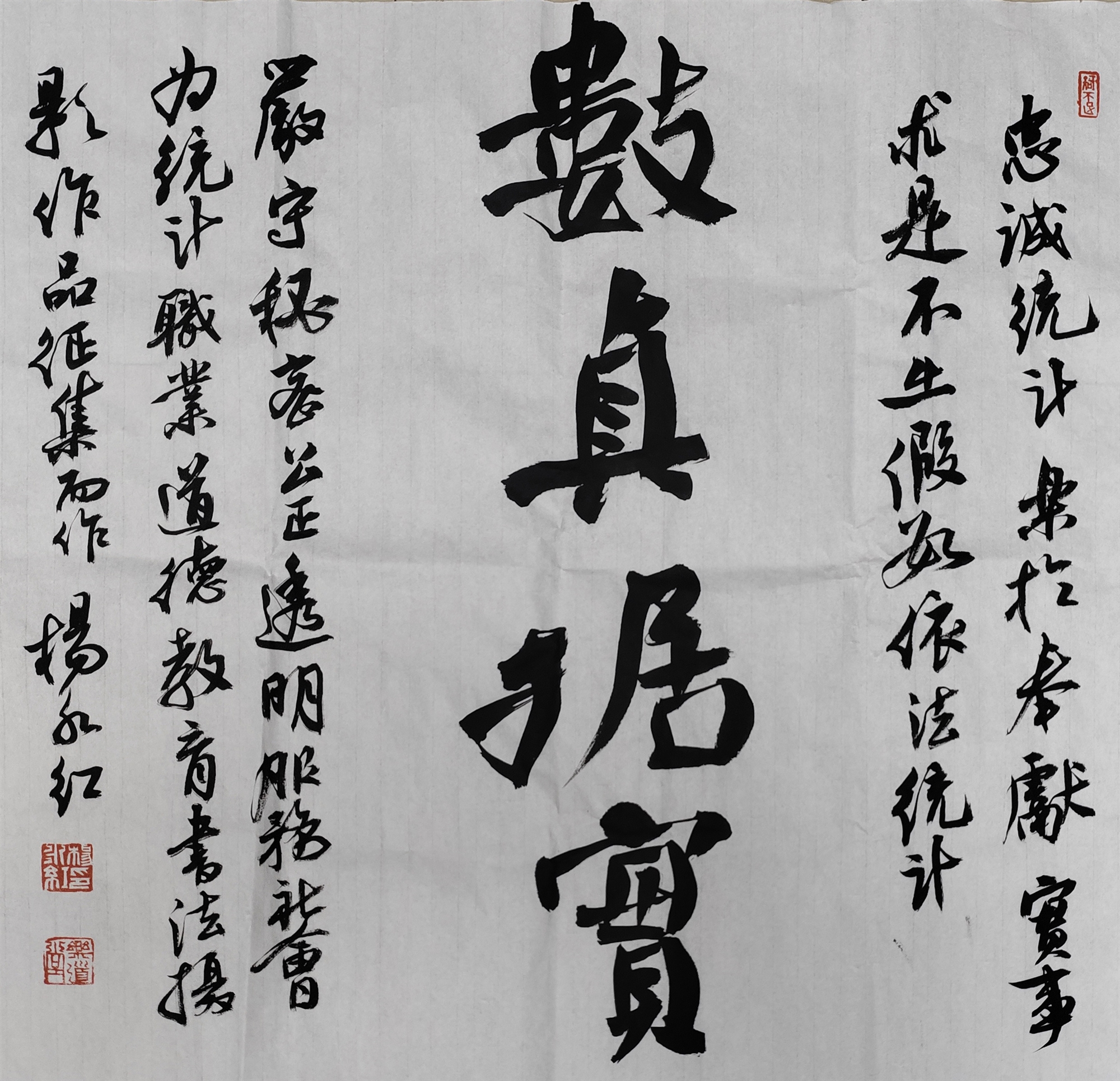 書法作品《數(shù)真據(jù)實》風(fēng)格端正、筆力沉穩(wěn),將 “實事求是” 的統(tǒng)計精神融入筆墨藝術(shù),直觀展現(xiàn)了統(tǒng)計調(diào)查工作者對數(shù)據(jù)真實可靠的核心追求,彰顯了對統(tǒng)計事業(yè)的敬畏之心與責(zé)任擔(dān)當。
