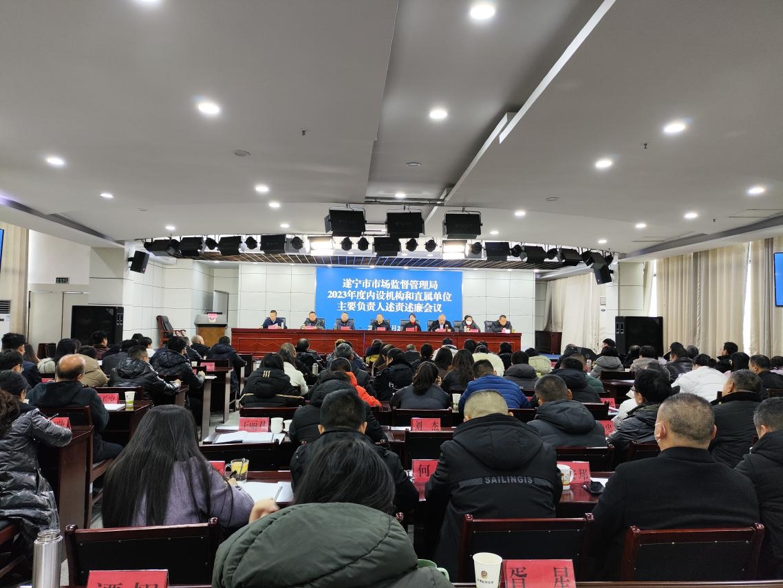 1月26日,遂寧市市場監管局召開2023年度內設機構和直屬單位主要負責人述責述廉會議。會議由局黨組成員、總經濟師、機關黨委書記李隆志主持,局領導班子成員,駐局紀檢監察組,機關、支隊全體干部職工,下屬事業單位班子成員參加會議。