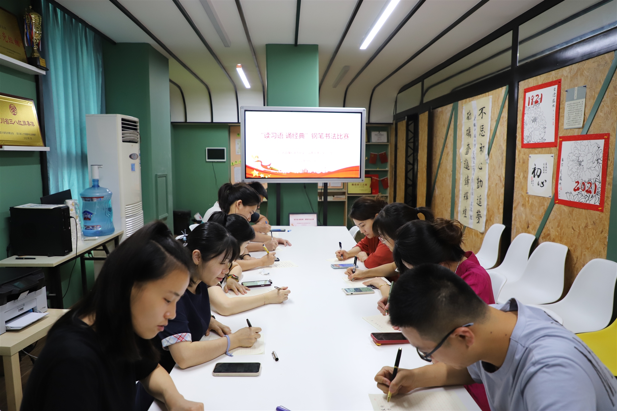 參賽人員在線上相互分享、線下認真誦讀的基礎上,使用鋼筆、米字格書法專用紙張選擇抄錄“習語金句”進行展示,評委小組對20多篇參賽作品分別從內(nèi)容、書寫、結構、筆法、字形、整體效果六個方面逐項評審、綜合打分,評選出一、二、三等獎進行了表揚獎勵。