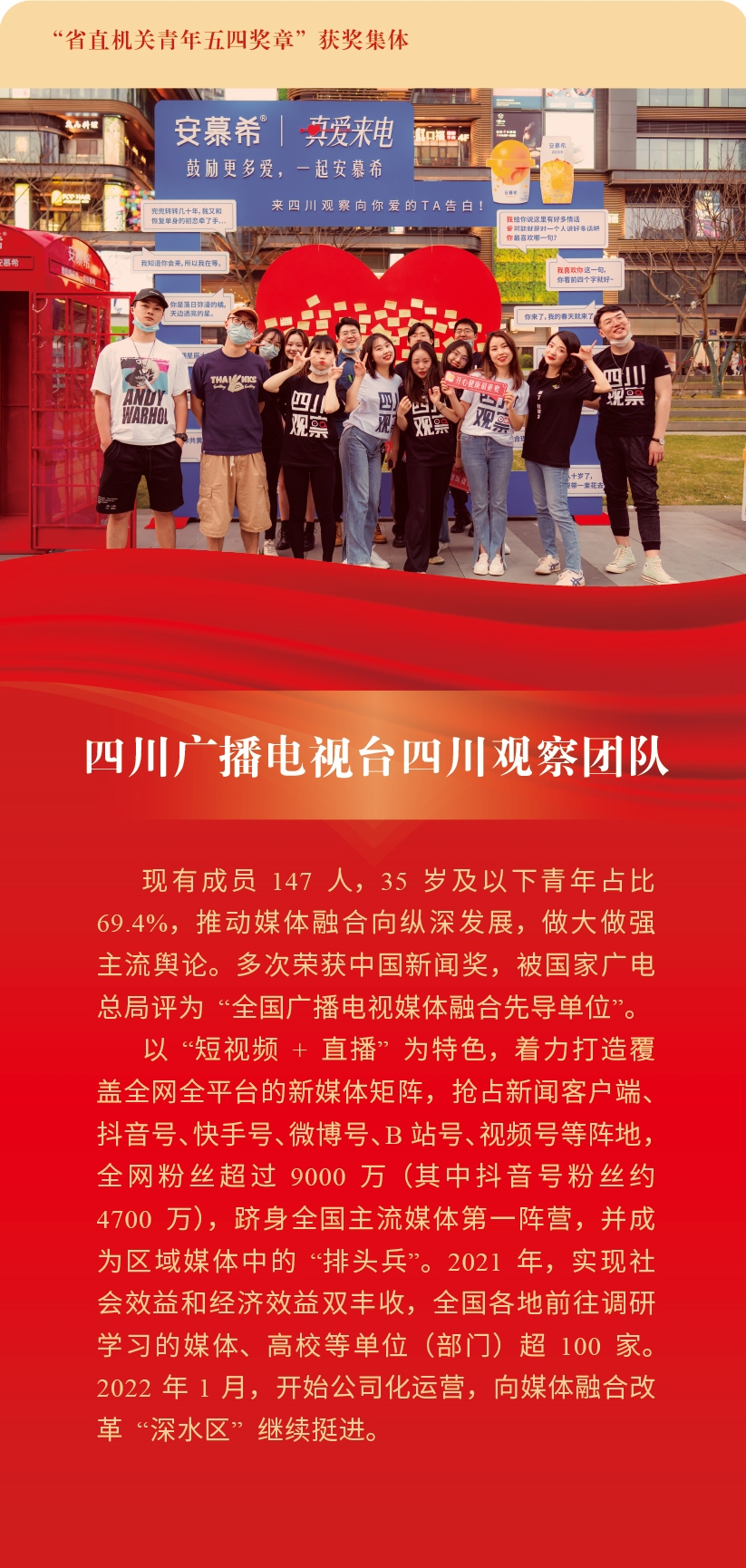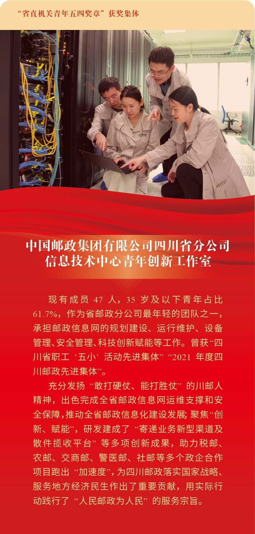 為集中展示新時代四川省直機關(guān)青年的精神品格和價值追求,激勵全省廣大機關(guān)青年學(xué)習(xí)先進、爭當先進,以優(yōu)異青春業(yè)績貫徹落實習(xí)近平總書記來川視察重要指示精神和省第十二次黨代會精神,近日,共青團四川省直機關(guān)工委、四川省直機關(guān)青年聯(lián)合會發(fā)布了關(guān)于授予“四川省直機關(guān)青年五四獎?wù)?rdquo;的通報,授予6名個人“四川省直機關(guān)青年五四獎?wù)?rdquo;稱號,授予10個集體“四川省直機關(guān)青年五四獎?wù)录w”稱號。