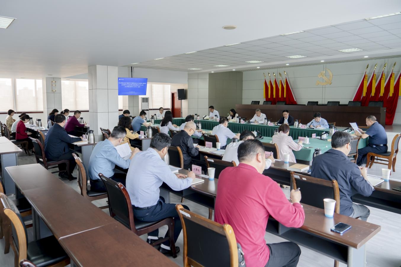 在家局領導,省委主題教育第十五巡回指導組有關同志,二級巡視員,駐商務廳紀檢監察組副組長,省經濟合作促進中心副主任,各處室負責同志列席會議。