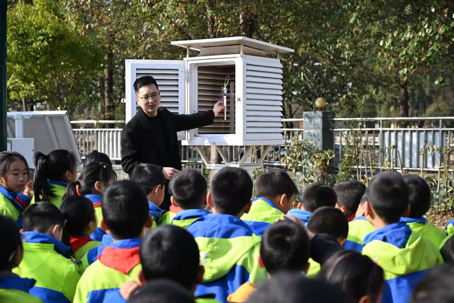 走進昭化區元壩一小,校園內的國家級無人值守氣象站變身“科學課堂”。機關第一黨支部書記黃亞林向同學們講解了風向風速傳感器、溫濕度傳感器、雙翻斗雨量傳感器等儀器的功能,結合同學們的疑問進行詳細解答,“這個雙翻斗就像天平的托盤,雨滴落下時會觸發計數裝置……”深入淺出的講解和現場操作讓抽象原理具象化。當氣象學會理事長王璐思展示風云氣象衛星模型、講解其用途時,孩子們仰望“人造星辰”的眼神充滿向往。